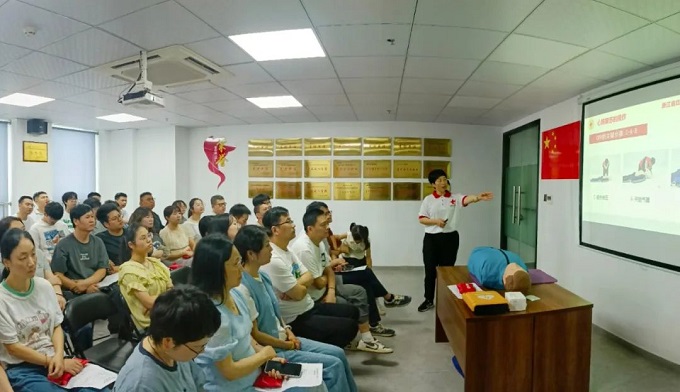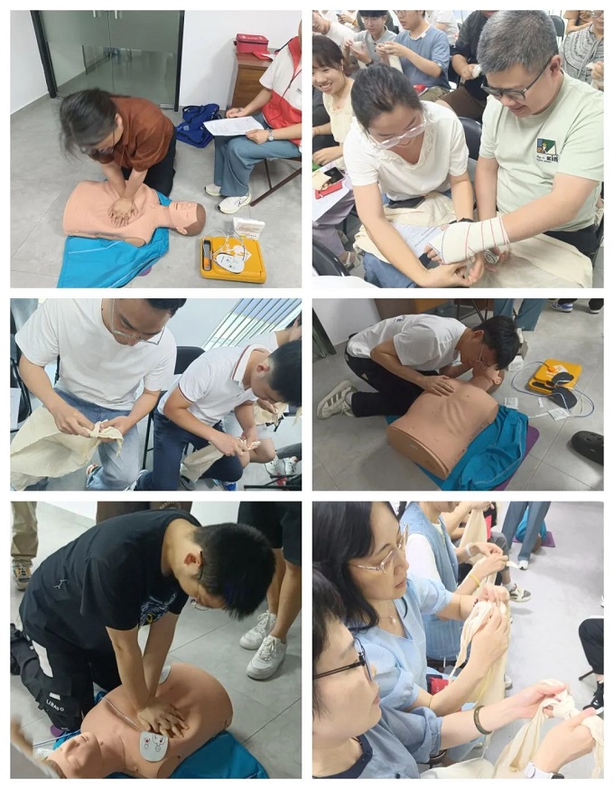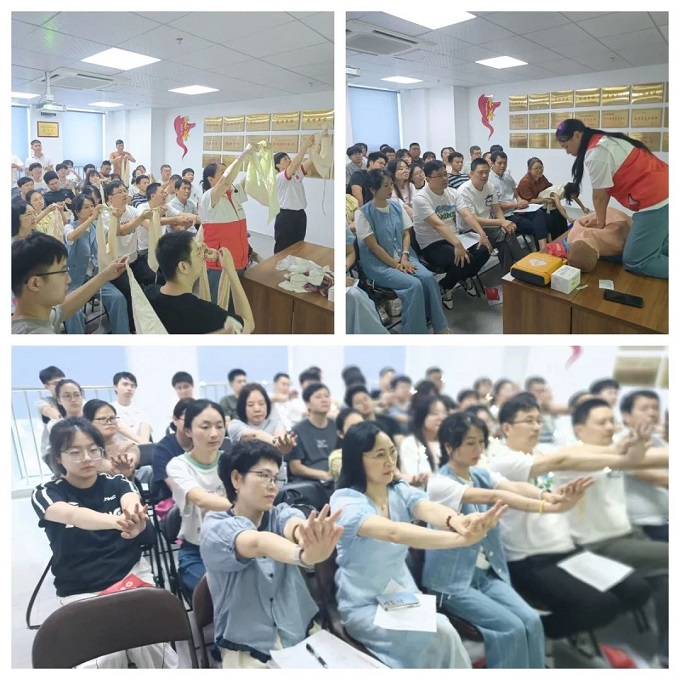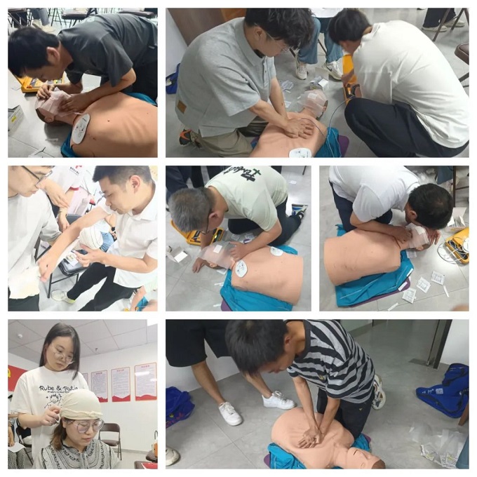 培训老师用生动形象的案例加上理论教学、实操练习等多种形式重点向大家讲解了心肺复苏、AED操作使用、气道异物阻塞救治等知识,并用复苏模拟人给学员们做了心肺复苏和AED操作标准示范,细致阐述了现场救护技巧。培训现场,大家积极参与,踊跃上台进行模拟演练、互动答疑。