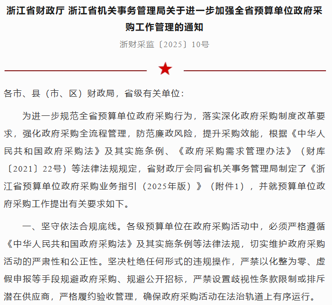 浙江两部门联合发文:进一步加强全省预算单位政府采购工作管理(附政策解读) 2025-09-28 浙江省预算单位政府采购业务指引(2025版).docx单一来源采购公示情况说明.docx《关于进一步加强全省预算单位政府采购工作管理的通知》征求部门意见及采纳情况说明.doc转载:... -