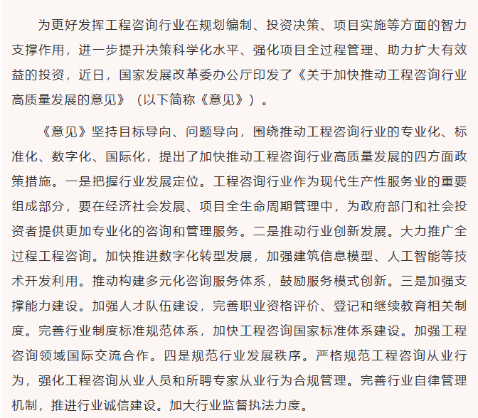 国家发展改革委办公厅印发关于加快推动工程咨询行业高质量发展的意见 2025-09-28 为更好发挥工程咨询行业在规划编制、投资决策、项目实施等方面的智力支撑作用,进一步提升决策科学化水平、强化项目全过程管理、助力扩大有效益的投资,近日,国家发展改革委办公厅印发了《关于... -