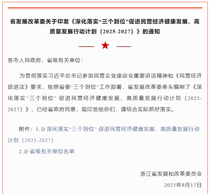 浙江出台三年行动计划 全力推动民营经济高质量发展 2025-09-28 省发展改革委关于印发《深化落实“三个到位”促进民营经济健康发展、高质量发展行动计划(2025-2027)》的通知各市人民政府,省级有关单位:为贯彻落实习近平总书记参加民营企业座谈会... -